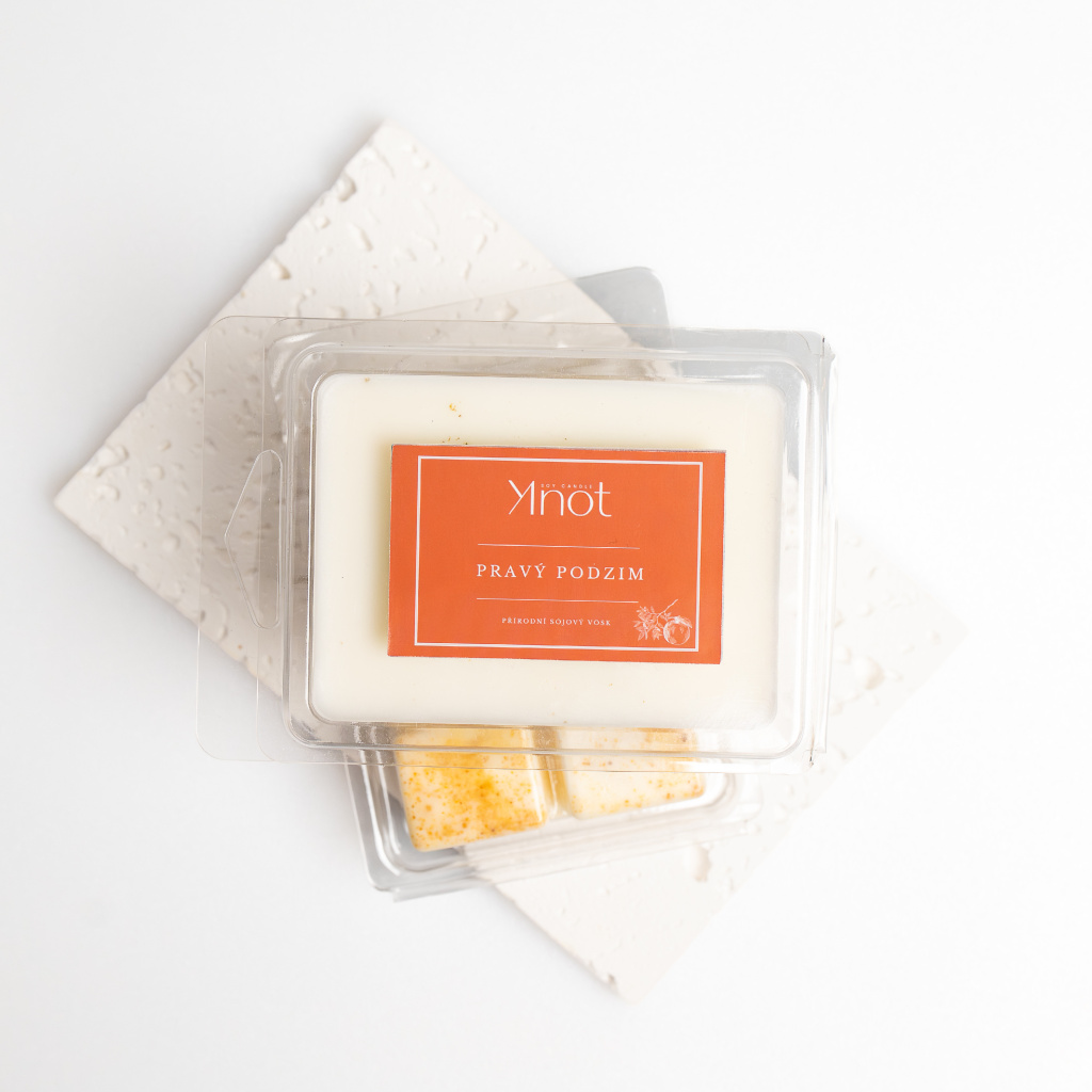 Sójový vosk Podzimní dny přináší neobyčejný zážitek. Vůně pomeranče přináší intenzivní a citrusový nádech, citron přidává osvěžující kyselost a kořeněným doplněk je skořice s hřebíčkem.